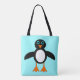 This awesome tote bag features a cute penguin character with a white tummy, big blue eyes with black pupils and cute orange feet and beak. This charming little winter bird is sure to delight children and adults. The penguin sits on an icy pale blue background to remind him of his chilly Arctic home.