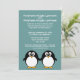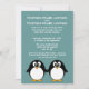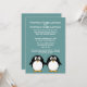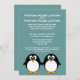 An informal wedding invitation with a clean, modern cartoon drawing of a penguin.