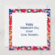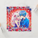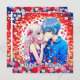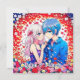 Anime boy and girl cuddling surrounded by colourful flowers. Cute anime couple, girl with pink hair and boy with blue hair. Personalize by adding your names in the personalize area.
