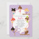 Cute and personalized gymnastics birthday party invitations with seven kawaii gymnasts in colourful leotards. Whether your little gymnast loves the balance beam, tumbling or rhythmic ball and ribbon floor routines, she'll love this adorable gymnastics themed birthday party invite. Purple and white polka dots background on the front and pink and white polka dot pattern on the back. Little girls in ponytails and buns with blonde, black, red and brown hair and light and dark skin tones to represent every little girl! Artwork © Chrissy H. Studios, LLC. All rights reserved.
