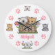 This wall clock features cute cats and kittens with pink paw prints. It can be personalized with a name or any text that you wish to add.