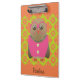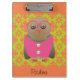 Personalized clipboard with an old lady owl, wearing bright pink glasses and vest, and sitting on an orange background with a yellow / green floral pattern. Add your own text.