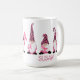 Whimsical gnomes holding pink breast cancer awareness ribbons.