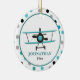 This cute holiday ornament features old fashioned airplane in teal and black on a white and teal round frame with polka dot background in grey, teal, black and white. Add your child's name and year for a personal touch.