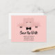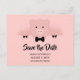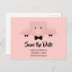 Save the date card with a big pink pig face wearing a formal bow tie. Showing off his cute black hooves.