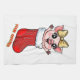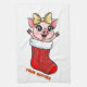 A whimsical hand-drawn illustration of a cheerful cartoon piglet peeking out from a festive red Christmas stocking. Featuring big sparkling eyes, rosy cheeks, and a bright yellow bow, this playful artwork is inspired by classic children’s book styles. The knitted stocking texture with fluffy white trim adds warmth and holiday charm.
