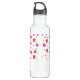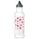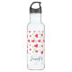 Personalized water bottle with a cute pattern composed of pink and green tumbling hearts on a white background.