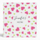 Personalized binder with a cute pattern composed of pink and green tumbling hearts on a white background. Layered over top is a white circle with a name and title inside.