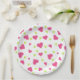 Paper plate with a cute pattern composed of pink and green tumbling hearts on a white background.