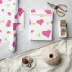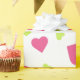 Wrapping paper with a cute pattern composed of pink and green tumbling hearts on a white background.
