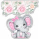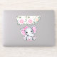 Vinyl decal / contour sticker with a cute pink elephant watercolor illustration. She has cute pink and white polka dot ears and a pretty pink ribbon bow on top of her head. The top is decorated with a beautiful rose bouquet.