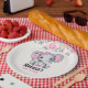 Paper plates with a cute pink elephant watercolor illustration. She has cute pink and white polka dot ears and a pretty pink ribbon bow on top of her head. The top is decorated with a beautiful rose bouquet.
