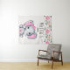 Personalized room tapestry with a cute pink elephant watercolor illustration. She has cute pink and white polka dot ears and a pretty pink ribbon bow on top of her head.