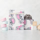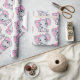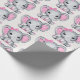 Wrapping paper with a cute pink elephant watercolor illustration. She has cute pink and white polka dot ears and a pretty pink ribbon bow on top of her head.