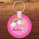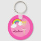 This cute custom ballerina girl gift features a blonde ballet dancers en pointe underneath a pretty rainbow on a light pink circle background bordered by hot pink. A beautiful personalized present for a child who loves ballet dancing.