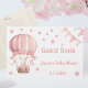 Lovely bunny flying in a balloon surrounded by stars. Illustration in shades of pink on a white background. Guest Book for wishes for baby perfect for a baby shower if you're expecting a girl. On the back side illustration of pink stars and gifts.