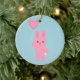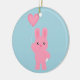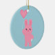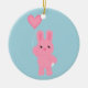 A sweet, pink, kawaii style bunny, with a chubby face, arms and legs, is holding a pink heart shaped balloon on a light blue polka dot background.