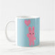 A sweet, pink, kawaii style bunny, with a chubby face, arms and legs, is holding a pink heart shaped balloon on a light blue polka dot background.