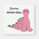 A cute pink dinosaur with pink spots and a green spikey tail. A big grin on her face. Says 'You're Dino-mite'