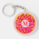 Cute pink doughnut keychains with custom name monogram. Round button key chains for women and girls. Add your own name initial letter. Brush script typography template. Elegant monogrammed party favour gift idea for kid's Birthday, wedding, bridal shower, baby shower, bachelorette, girls weekend etc. Fun for children and adults. Sweet doughnut with coloured sprinkles design. Change quantity to get the cheap bulk price. Fun food graphics.
