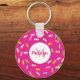 Cute pink doughnut keychains with custom name monogram. Round button key chains for women and girls. Add your own name initial letter. Brush script typography template. Elegant monogrammed party favour gift idea for kid's Birthday, wedding, bridal shower, baby shower, bachelorette, girls weekend etc. Fun for children and adults. Sweet donu with coloured sprinkles design. Change quantity to get the cheap bulk price. Fun food graphics.