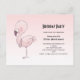 Birthday party postcard invitation with a whimsical hand drawn pink flamingo.