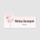 A name tag with a whimsical hand drawn pink flamingo.