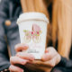 Cute pink flower-decorated baby stroller illustration, paper cups for your baby shower celebration.