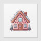 An adorable illustration of a pink gingerbread house with heart decorations, snow, and two festive pine trees.