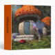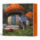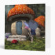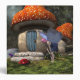 A cute pink-haired fairy with blue wings greets a ladybug who has wandered into a magical forest near the fairy’s little mushroom house.