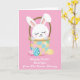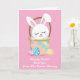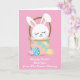 Customize this cute Happy Easter Bunny card with your own personalized text with your kids name in white script. This adorable bunny rabbit sits in a pretty Easter basket on a lovely pink card.