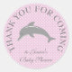 Cute pink polka dots and grey dolphin baby shower stickers. Personalized Thank you for coming baby shower party favour stickers Funny sea animal design for cute little newborn boys and girls. Gender neutral. Pretty thank you labels with customizable background colour. ie soft yellow, grey, purple, light blue or girly pastel pink. Elegant typography design with calf for babyshower thank you favours. Also handy as envelope seals / sealers to say thanks for coming or thank you for sharing our special day! White polkadots print. Available in small and large size. Round glossy tag stickers. Also nice for 1st Birthday party.