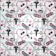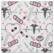 Pattern design featuring a heart shaped stethoscope, caduceus EKG, shots, thermometers, bandages and pills in pink, black, grey and white by Holiday Hearts Designs (all rights reserved).