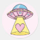 Greetings, Earthlings! Plan an out-of-this-world alien-themed birthday with this Cute Pink UFO Round Sticker. The design features a digital illustration of a pink and purple UFO that is beaming up a pink heart. It is perfect for a party celebrating the spaceship lover in your life.