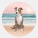 Cute Pitbull Dog Sitting on Beach with sunset Classic Round Sticker
