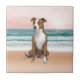 Cute Pitbull Dog Sitting on Beach with sunset Tile