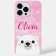 Phone case featuring a cute little polar bear on a pink background and customizable name above.