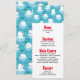 Menu card with a cute Christmas pattern featuring polar bears standing on floating ice wearing red santa hats. Little igloos, snowflakes and fish surround these adorable polar bears chilling on the water. Light blue background. Cute and whimsical holiday design.