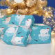 Wrapping paper with a cute Christmas pattern featuring polar bears standing on floating ice wearing red santa hats. Little igloos, snowflakes and fish surround these adorable polar bears chilling on the water. Light blue background. Cute and whimsical holiday design.