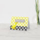Sweet baby gift thank you note card, with fun yellow and white polka dots, on the top and grey with white polka dots, on the bottom of the card. A cartoon yellow duck holding a grey sign reading Thank You decorates the front. Personalize the white and black text to read what ever you want. The perfect thank you for all your baby gifts.