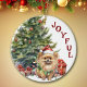 On the front of this Holiday ornament is the image of an adorable little Pomeranian dog wearing a red and white Santa hat. The dog sits in front of a decorated Holiday tree, and is wrapped in a string of festive lights. Red text at the side says "JOYFUL". On the back, red and green text says MERRY CHRISTMAS", and there are additional text fields for you to customize. Make it say whatever you'd like!