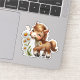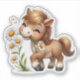 Contour sticker with an adorable illustration. A little brown pony happily eating daisies.