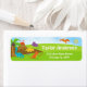 Adorable dinosaurs featuring a purple brachiosaurus, orange tyrannosaurus, green stegosaurus, pink triceratops and pink and orange pterodactyls. In the background is a volcano, sunshine, sky and clouds, palm tree, dinosaur footprints and eggs.