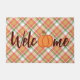 Modern farmhouse country cottage style doormat with cute orange harvest pumpkin Welcome wordart quote text on a fall season warm orange coloured gingham plaid check pattern.
