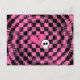 Adorable girly hot pink and black emo, scene, and punk rock retro 80s chequerboard pattern with a skull and broken heart on a post card.
