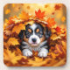 A cute puppy dog Autumn themed coaster. A sweet little puppy dog playing in a pile of Autumn leaves. He's peeking out adorably as he hides in the pile of leaves.