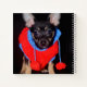 Adorable portrait photograph of a small puppy wearing a soft red and blue wool sweater with pom poms.