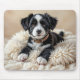 A small, black and white puppy lies comfortably on a plush, cream-coloured blanket and pillow