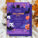 Invite your friends to a fun and playful Halloween party with this charming invitation! Featuring adorable illustrations of bats, a cute black cat, carved pumpkins, and skulls, all set against a vibrant purple background. The design has a whimsical and lighthearted style perfect for a friendly gathering. The text on the invitation is fully customizable, allowing you to personalize the details of your event. Make your Halloween celebration even more special with this delightful invite!