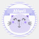 NewParkLane - Personalized Back to School Stickers for kids, with a template for your name in a lilac banner, and a cute cat in different shades of purple. In the background a sweet lavender and white striped pattern.